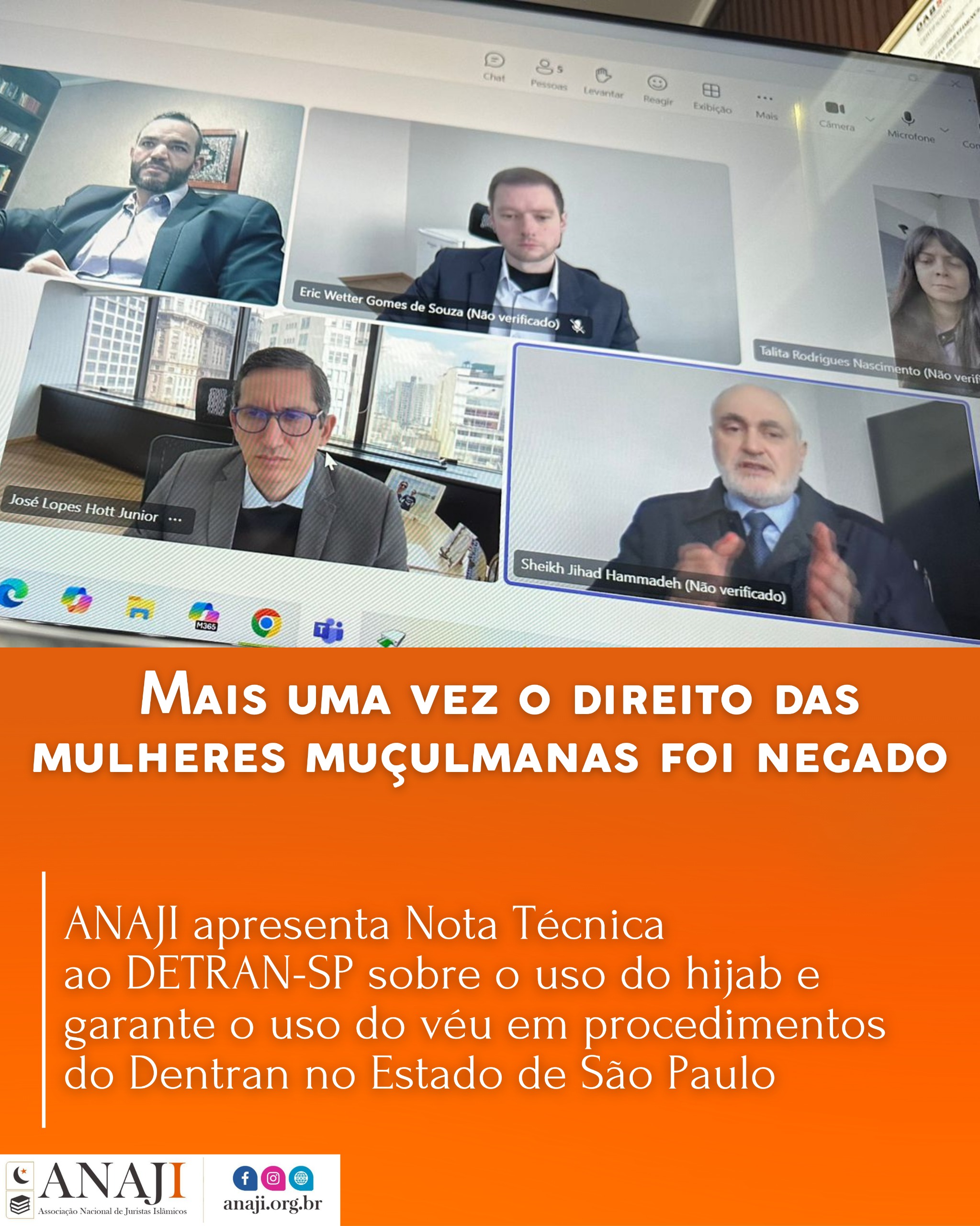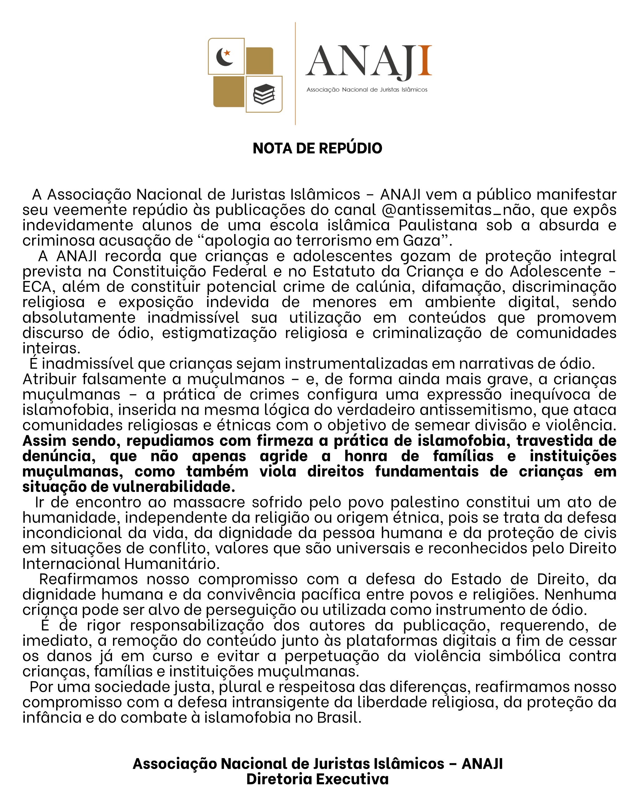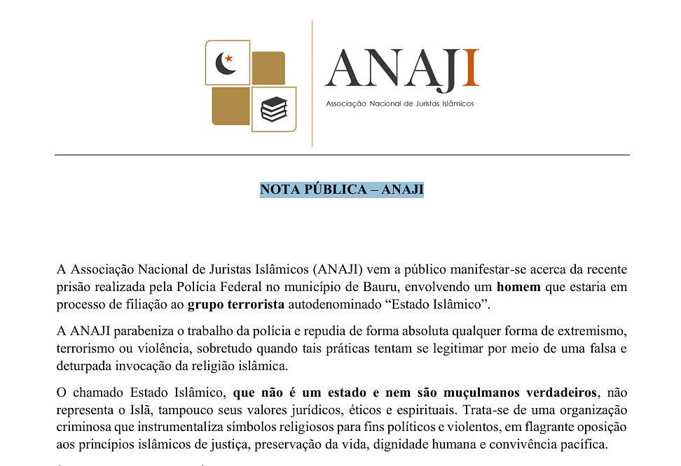 ANAJI, é uma associação autônoma, sem fins lucrativos, formada por juristas muçulmanos de todo o Brasil, cujo objetivo é a proteção jurídica de toda a coletividade muçulmana brasileira, garantindo-lhe o livre exercício da prática religiosa, bem como o combate jurídico de atos de intolerância que ameacem a segurança da comunidade islâmica brasileira;
