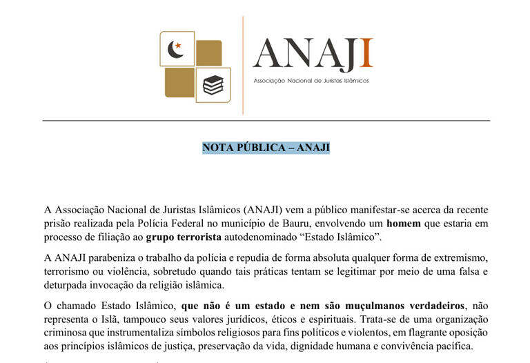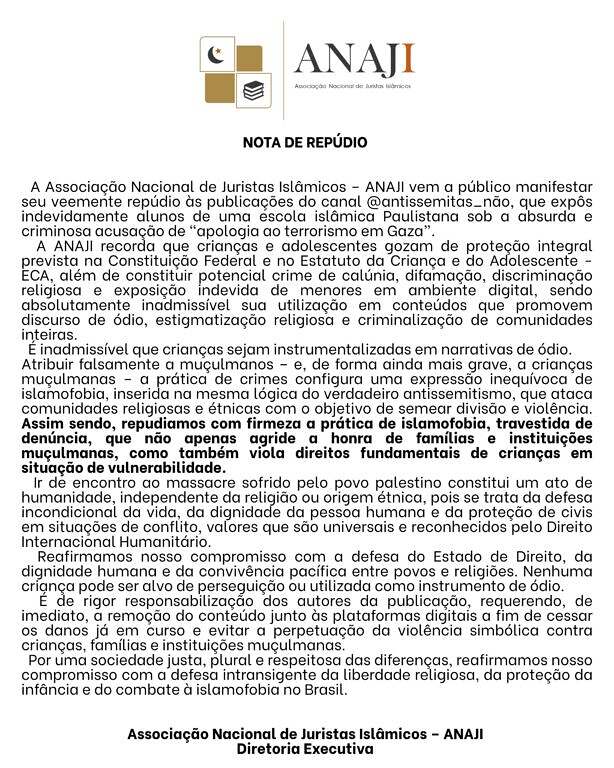A ANAJI reafirma seu compromisso com a justiça, a paz e o Estado Democrático de Direito.Repudiamos de forma absoluta o extremismo e qualquer tentativa de associar a violência ao Islam, que é uma religião de preservação da vida, dignidade humana…