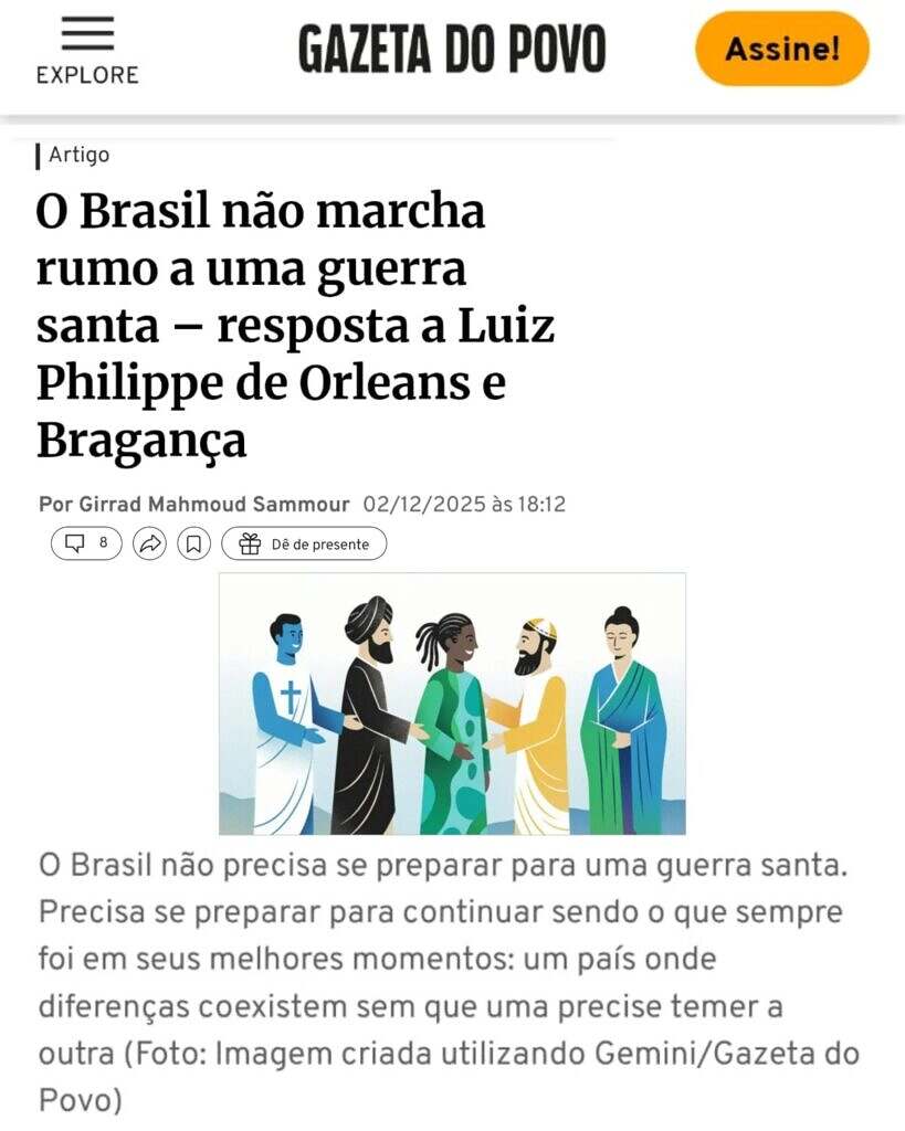O artigo do príncipe Luiz Philippe de Orleans e Bragança, O Brasil e a próxima Guerra Santa, recentemente publicado, apresenta ao público uma narrativa dramática: a ideia de que o Ocidente estaria prestes a sucumbir a um suposto “projeto islâmico” de conquista demográfica e cultural. Essa leitura, além de imprecisa, incorre em generalizações que estimulam medo social, desinformação religiosa e hostilidade entre brasileiros de diferentes crenças.